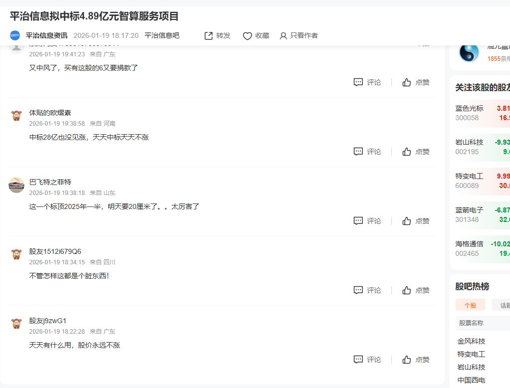 被投资者在股吧中戏称为“中标最多,股价不涨”的平治信息(SZ300571),在1月19日盘后再发《中标候选人公示的提示性公告》。