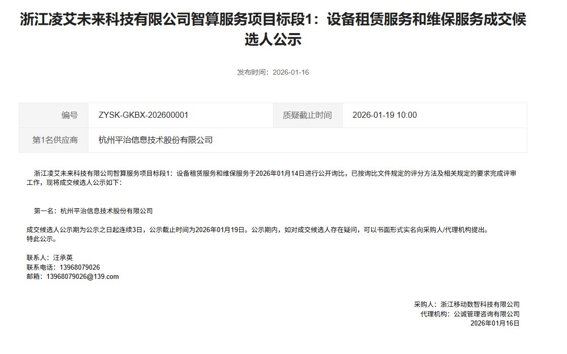 截至1月19日,平治信息在2026年已发布3条中标候选/拟中标公告,直接招标人均为运营商或旗下公司。