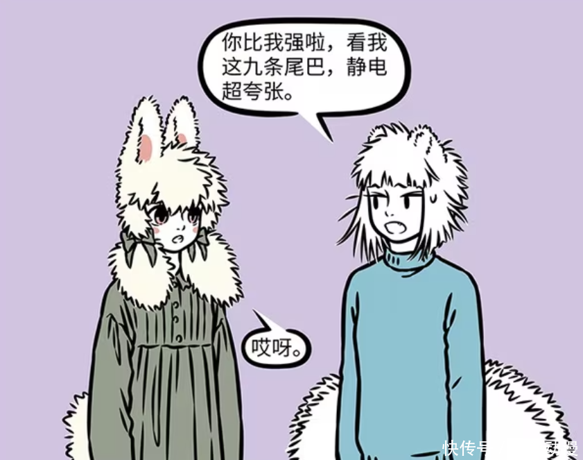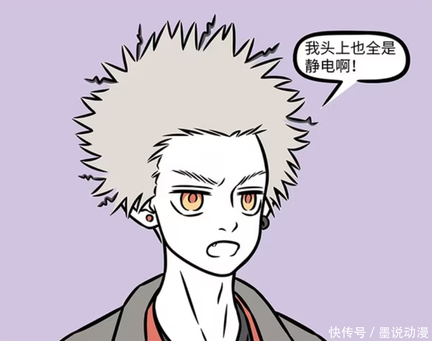 《非人哉》漫画版中,众多角色被静电影响顺策略,比如小玉和九月,那是浑身炸毛。孙悟空之所以变成爆炸头,也是因为筋斗云吸收太多静电,变成雷云,一直劈中孙悟空。女娲的小蛇也受不了静电,也被电晕过去。妈祖想体验一下静电的感觉,甚至在头发里面养电鳗。