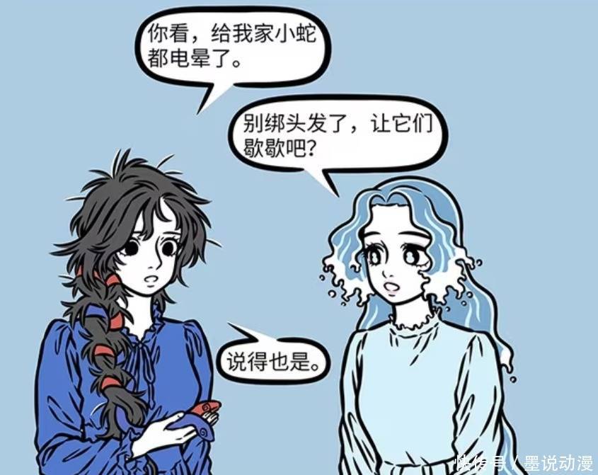 女娲的两条小蛇,被静电电晕过去,所以也就没办法帮女娲绑好头发。妈祖建议女娲,让这两条小蛇好好歇一歇。如果一直绑在女娲的头上,它们会一直遭受到电击,也会频繁晕倒。